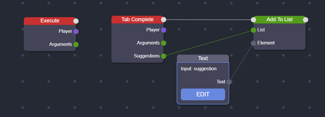 - Execute: This listener is triggered when a player executes the command. The arguments provided by the player are stored in a list.