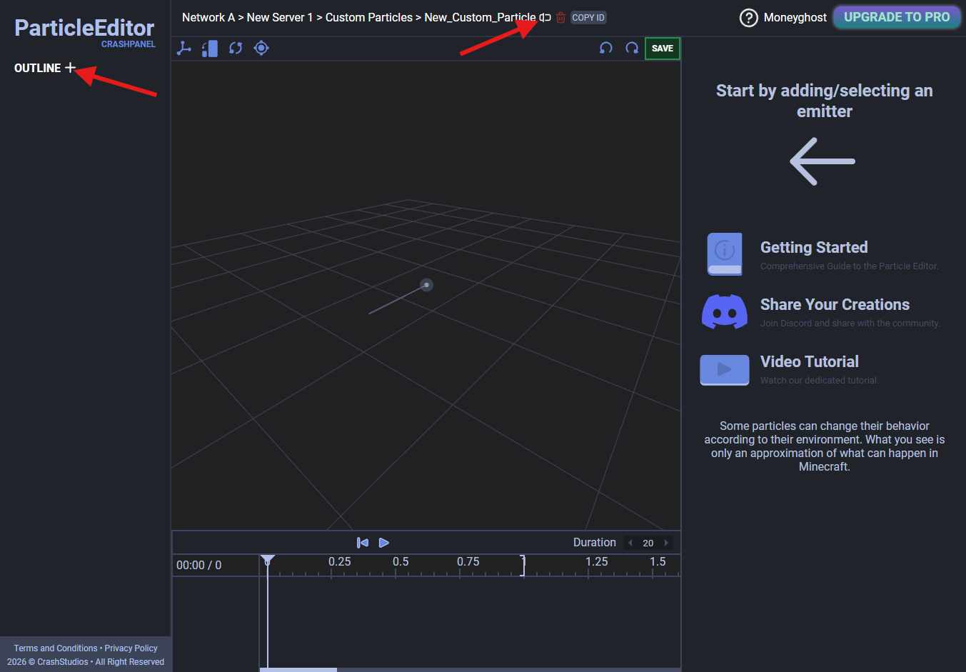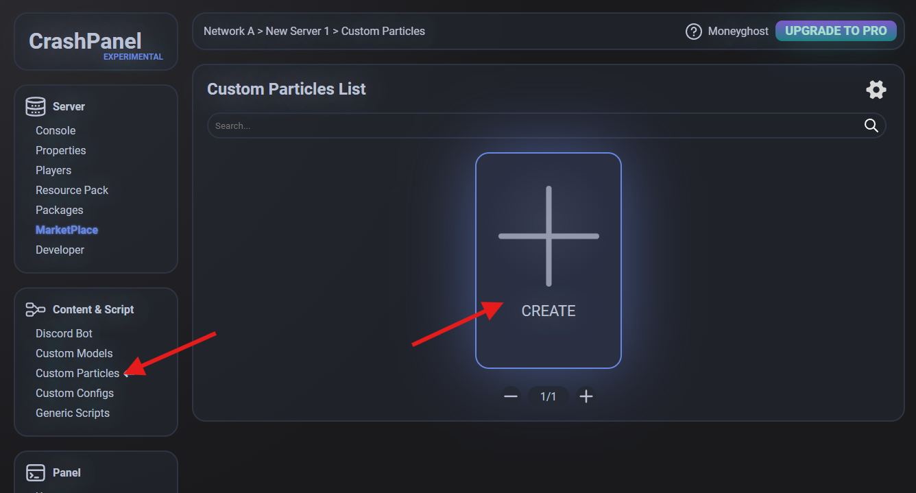 From your server's CrashPanel, click Custom Particles (in the Content & Script section) and then click CREATE to create a new Custom Particle.