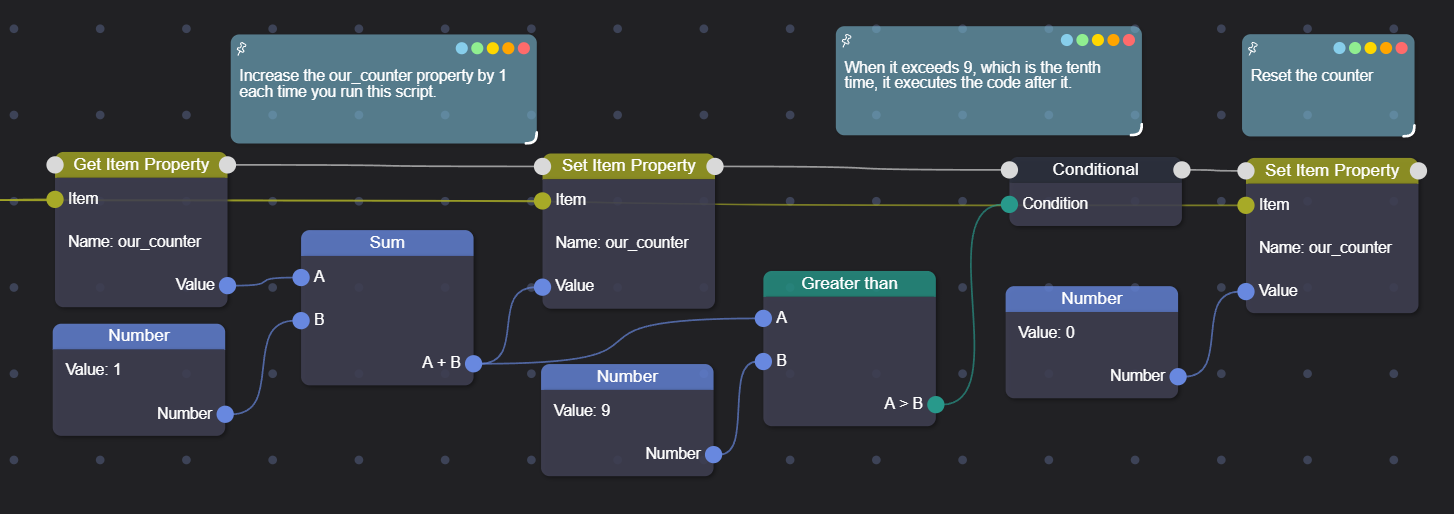 To create a counter in an item, you can use its properties. Similarly, you can do this with the server, worlds, CrashBlocks, and entities (often used on Players).