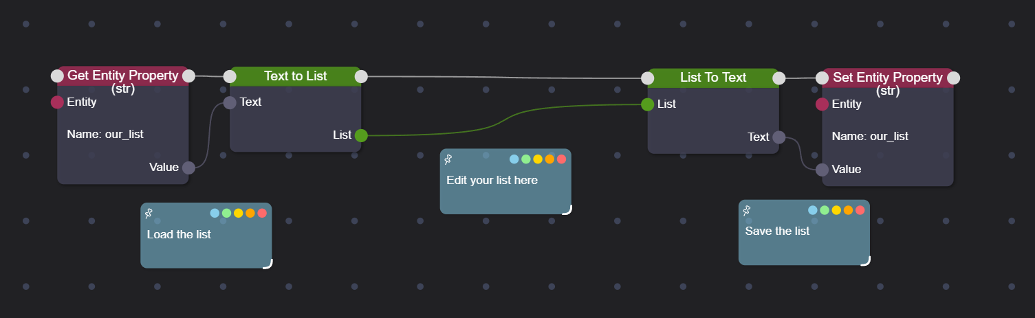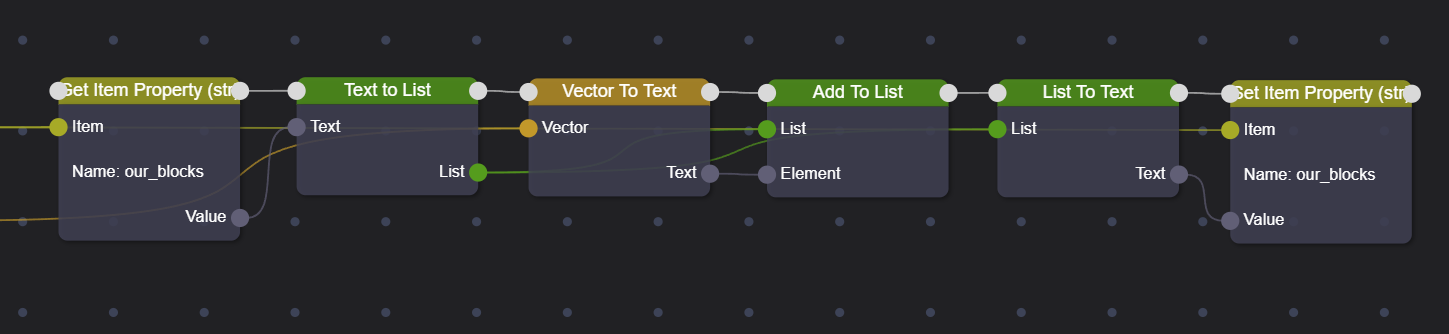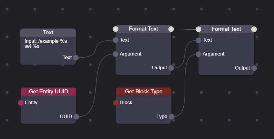For strings, we will only see the Text Format node, specifically for composing a command: /example %PLAYER_ID% set %BLOCK_TYPE%.