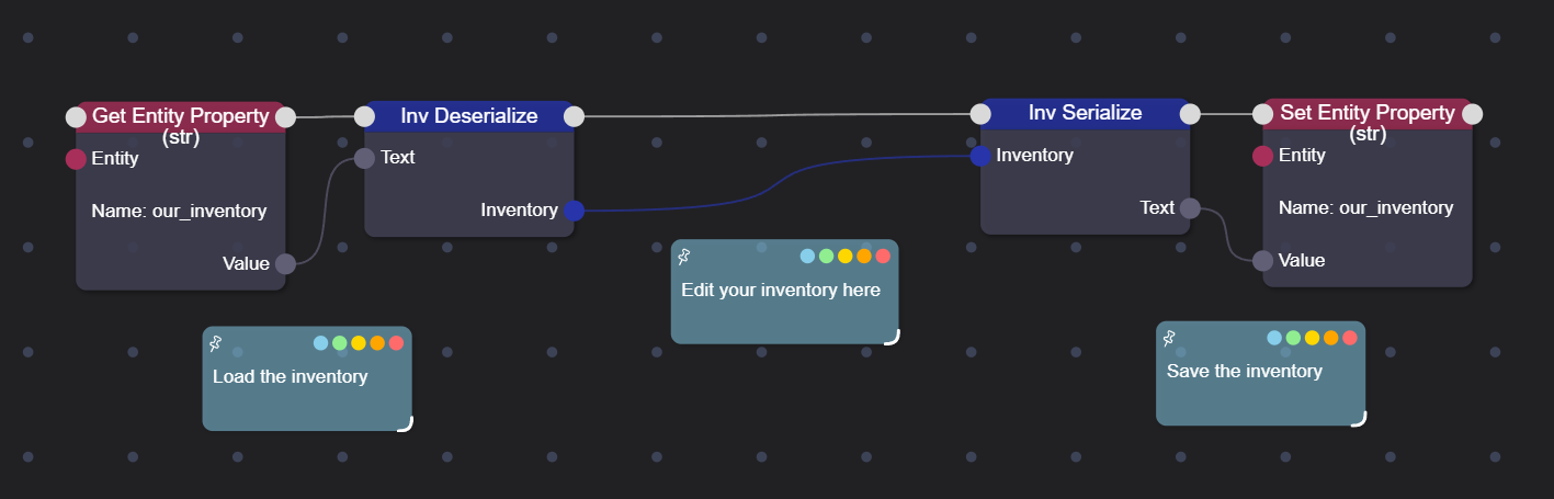 To save an inventory in the properties (and load it), you must use the conversion nodes between inventory and text.
