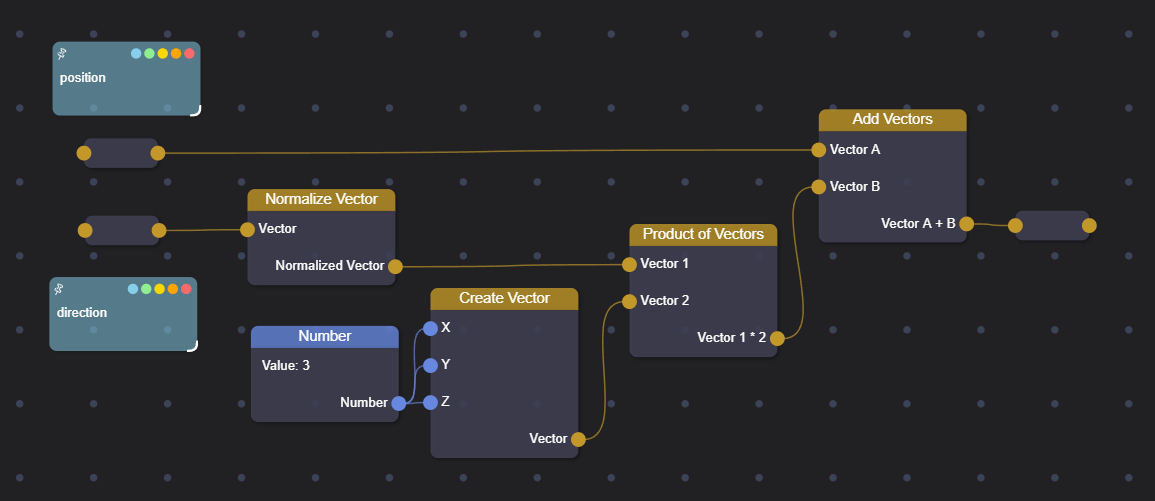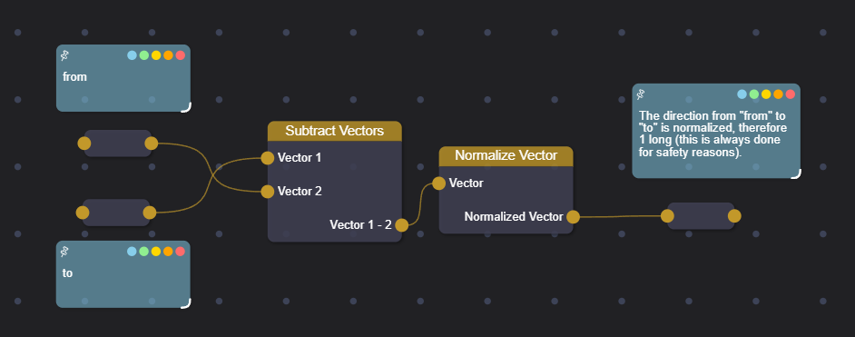 Here are three examples of vector management. In the first, the direction from one point to another is calculated; in the second, only one component is modified (in this case, the Y component is set to zero); and in the third, a point along a direction is taken (in our case, at a distance of 3).